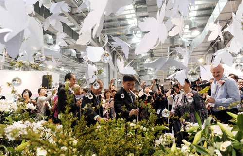 2011洲际杯花艺竞赛19日在花博争艳馆登场,由台湾百名花艺老师精心制作的“花之蝶舞”,在开幕式中吸引众人目光,盼透过象征“福气”的蝴蝶,为世界祈福。 图片来源:“中央社”