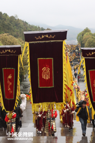 辛卯年清明海峡两岸祭祀炎帝神农氏大典4月3日在湖南炎陵县炎帝陵举行。图为大祭幡缓步进入祭祀广场。(中国台湾网 杨丽 摄)