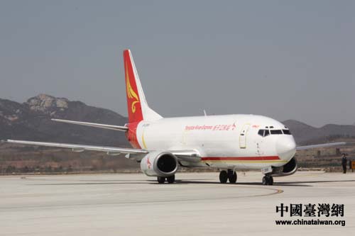 “繁星”、“点点”、“喜羊羊”、“乐羊羊”顺利抵达威海机场。图为飞机着陆后滑行。(中国台湾网 刘海伟 摄)