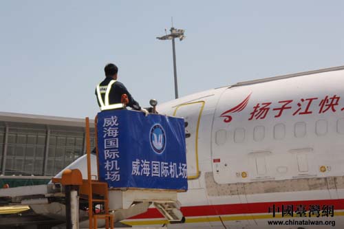 “繁星”、“点点”、“喜羊羊”、“乐羊羊”顺利抵达威海机场。图为机场地勤人员准备接“宝贝”们下飞机。(中国台湾网 刘海伟 摄)