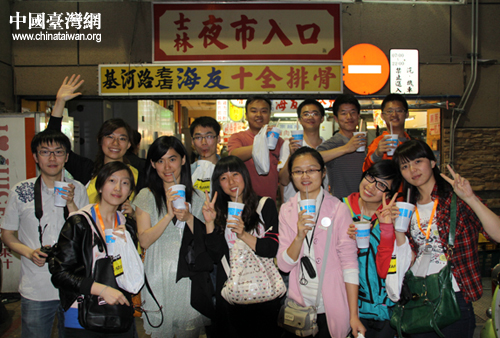 2011年4月10日,大陆高校参访团的学生们前往台北士林夜市品尝特色小吃,在夜市入口处合影留念。(中国台湾网 杨永青 摄)