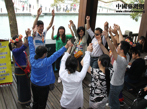 2011年4月12日,大陆高校师生在日月潭风景区与原住民一起载歌载舞。(中国台湾网 杨永青 摄)