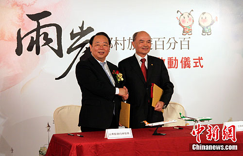 3月26日电,由山东省旅游行业协会和台湾休闲农业发展协会联合主办的“两岸乡村旅游百分百活动”今天在此间启动。图为山东省旅游行业协会会长于衝(左一)和台湾立荣航空公司董事长苏宏义共同签署互送客源协议。 陈立宇 摄