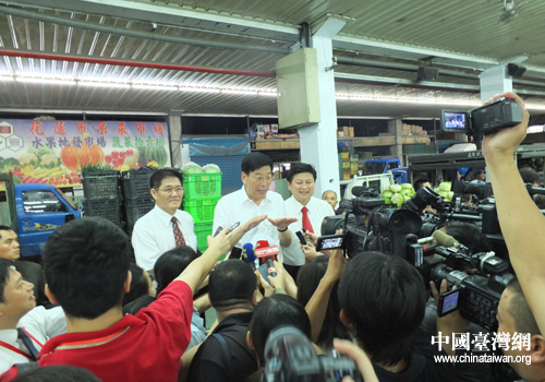 湖南省委副书记、省长徐守盛在花莲县吉安果菜市场接受记者现场提问。(图片来源:湖南省台办)