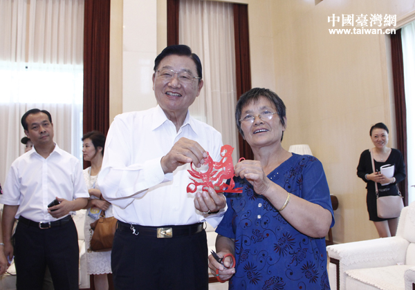 23日,首届两岸和谐家庭合唱节在辽宁省铁岭市隆重开幕。台湾三三会会长、前海基会董事长江丙坤率团参加活动。图为江丙坤在参观民间剪纸艺术时获铁岭市非遗产文化传承人,有名的剪纸艺人艾玉芹赠送寓意好运的福猴抱桃剪纸贴画。(中国台湾网 普燕 摄)