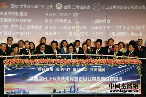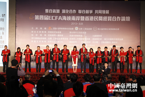 中国台湾网12月9日北京消息 9日下午,汇聚两岸三地民营企业精英、以“整合资源、深化合作、联合竞争、共同发展”为主题的第四届ECFA海峡两岸暨香港民间经贸合作论坛在北京举行。全国政协副主席李海峰,海协会顾问陈云林,台湾“三三企业交流会“会长、前海基会董事长江丙坤,世界华商联合促进会会长许荣茂等出席论坛。