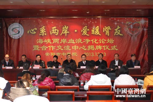 中国台湾网12月17日安阳消息 日前,“海峡两岸血液净化论坛暨合作交流中心揭牌仪式”在安阳市中医院举行。安阳市政府副秘书长赵世辉、市卫生局局长宋先忠,台北市政府卫生局副局长、医学博士陈南松,等出席揭牌仪式。安阳市中医院60余位医护人员参加了揭牌仪式。