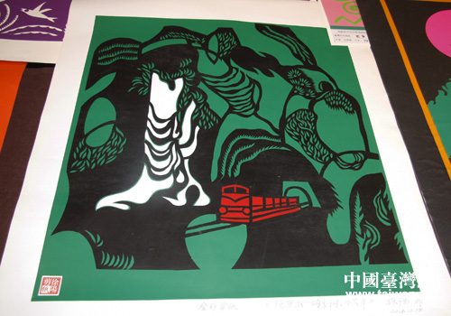 剪纸作品,作品中可看到阿里山神木、小火车。(中国台湾网 郭庆娜 摄)