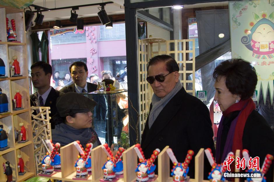 2月27日,中国国民党荣誉主席、两岸和平发展基金会董事长连战携夫人走访北京南锣鼓巷,并参观了位于南锣鼓巷的无限创艺店面。图为店主赵春香正在向连战夫妇介绍店内的工艺作品。中新社发 钟欣 摄