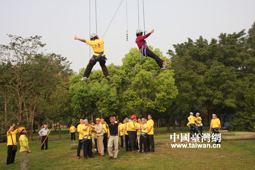 两岸校长在东莞台商子弟学校生命力营地体验团队互助协作。 (中国台湾网发 王羽威摄)