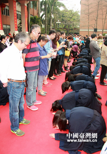 参加成年礼学生向父母行叩拜礼,感谢父母养育之恩。 (中国台湾网发 王羽威摄)