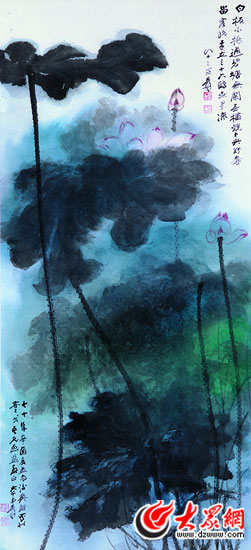 图为艺术展展出的张大千1982年创作的国画《泼彩荷花》。