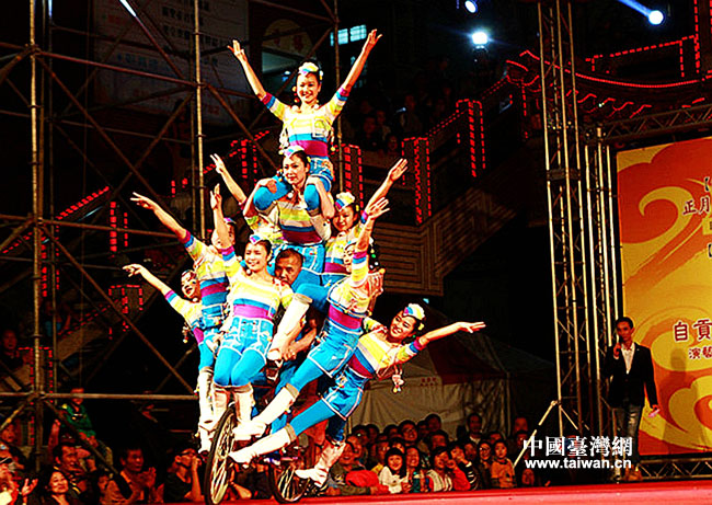 从初一开始,自贡市杂技团连续在高雄关帝庙和尖山元辰殿演出,场场观众爆满。每场演出长达80分钟,10多个杂技节目个个精彩纷呈,令现场观众时而紧张惊叫,时而捧腹大笑。双人柔术的柔美造型、优美抒情的“转碟”、花样翻新的“抖空竹”,女演员们的温情演出博得掌声阵阵。戏曲花坛节目中,硕大的青花瓷坛在男演员头上翻飞;钻地圈——青城道则将武术与杂技技巧相结合,展示出独特的西蜀风情;刚参加完瑞士圣诞马戏节载誉归来的节目“扛定车”,则让人见识了力与美的完美结合。此外,川剧的“变脸”、“吐火”和功夫熊猫“晃板跷碗”等节目将四川传统元素展现在了台湾观众眼前。自贡市杂技团副团长李轶说:“为了准备此次赴台演出,我们精心准备了几个月,专门编排了喜庆、热门的节目。看到现场的气氛这么好,节目能给台湾观众带来快乐,我们也非常高兴。”