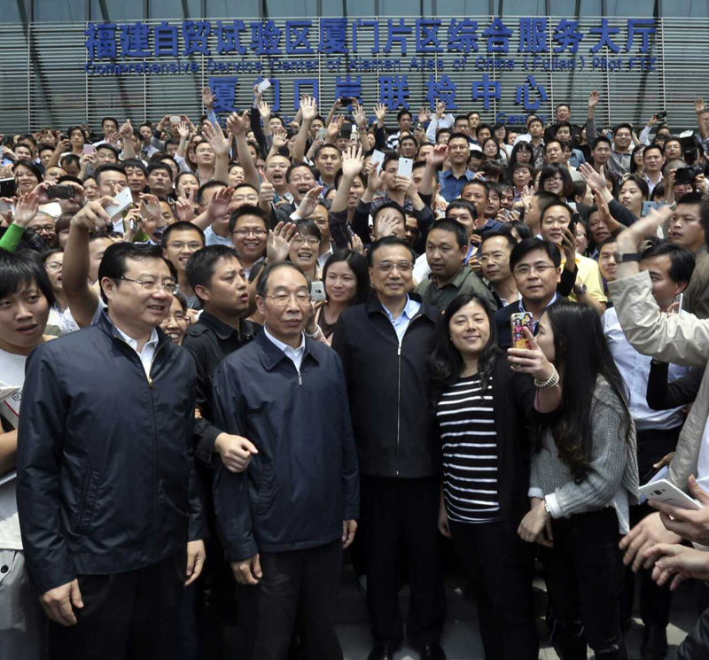 【福建自贸区厦门片区:总理来了!】4月22日,李克强来到挂牌刚刚一天的福建自贸区厦门片区,在象屿综合服务大厅考察自贸区改革经验推广落地、简政放权等情况。从两年前力推上海自贸区成立,到自贸区再结“三硕果”,再到总理本次基层调研,李克强的考察足迹已遍及上海、天津、广东、福建四个自贸区。