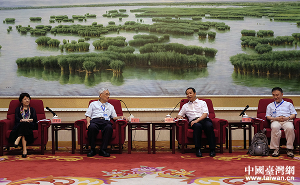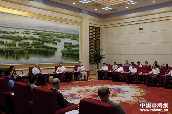 8日晚间,宁夏回族自治区副主席姚爱兴(左三)会见了由台湾世新大学讲座教授曾永义(左二)担任团长的“情系丝路·牵手宁夏——两岸文化联谊行”台湾交流团一行。(中国台湾网 普燕 摄)