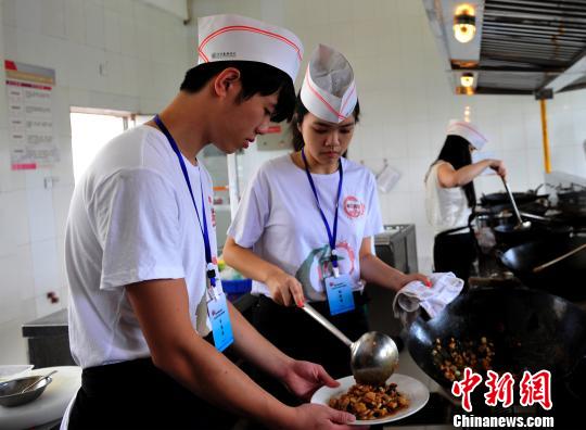 中新网成都7月23日电 (付敬懿 安源)“这盘菜取名百年修得同船渡,象征着台湾和大陆同学的友谊。”指着面前的剁椒茄子,台湾淡江大学的林书耘说,川菜体验营里四天的相处,让他与四川的大学生建立起深厚的友谊。23日,20名川台两地大学生头戴白色厨师帽,腰系黑色围裙,在四川旅游学院教室里以厨会友,展开一场“我是厨师我最牛”的厨艺比赛。同学们先要完成宫保鸡丁、钟水饺两个指定菜肴,再利用厨房的各类食材,自由发挥做出三道美食。
