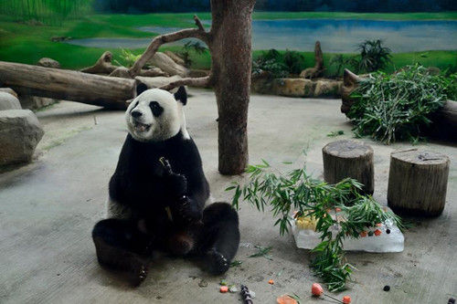 今年,台北市动物园的保育员用红萝卜、凤梨、竹子、葡萄等食材,为“团团”“圆圆”各做1个生日蛋糕,并用甘蔗做成表示11岁的“蜡烛”。“圆圆”的生日蛋糕有2个红萝卜做的爱心型冰块,“团团”的蛋糕则有2个用冰块、西瓜皮做成的大熊猫造型冰雕。