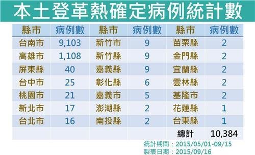 中新网9月16日电 据台湾“中央社”报道,台当局“卫生福利部疾病管制署”16日更新本土登革热病例数,自今年5月至今,全台病例数达10384例,其中台南市有9103例、高雄市有1108例。