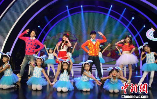 晚会上,台湾东森电视台蜜蜂姐姐和福建少儿频道蜗牛哥哥、长颈鹿哥哥、芭乐姐姐带动两岸小朋友作精彩表演。 黄帆 摄