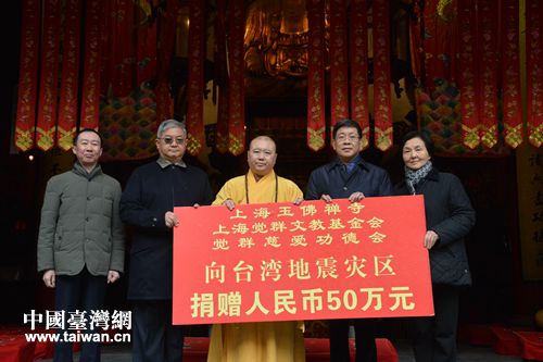 捐赠仪式上,上海玉佛禅寺、上海觉群文教基金会、觉群慈爱功德会向台湾地震灾区捐赠50万元。玉佛禅寺全体僧职人员及护法居士、觉群志工代表也纷纷伸出援手。