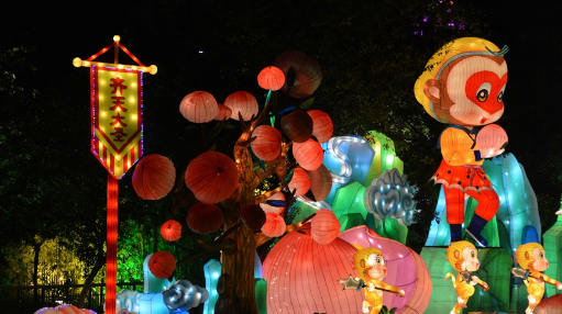 2016越秀花灯以《西游记》精彩故事为主线,将花灯展览与花卉展示相结合。以灯构花,以花展灯,以灯入景,以景寓意,实现“白天赏花,晚上观灯”。