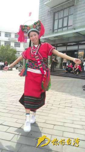 主办人合影,中间是穿着台湾少数民族服饰的台湾姑娘。