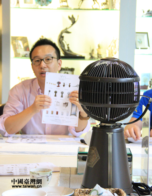 在2016天津台湾名品博览会即将举行之际,“寻迹台湾名品”媒体采访团于6月14日至19日走进台湾,探访台湾名品企业。图为美砌国际企业有限公司负责人许家祥介绍该公司新设计的桌上型电风扇。