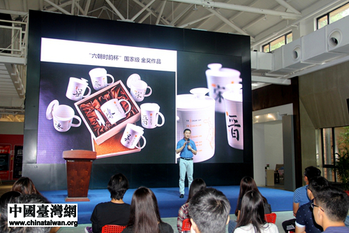 南京创意设计中心主任王子烨向海外台湾留学生长三角研习营营员们介绍具有南京元素的创意设计精品。(中国台湾网记者 李杰 摄)