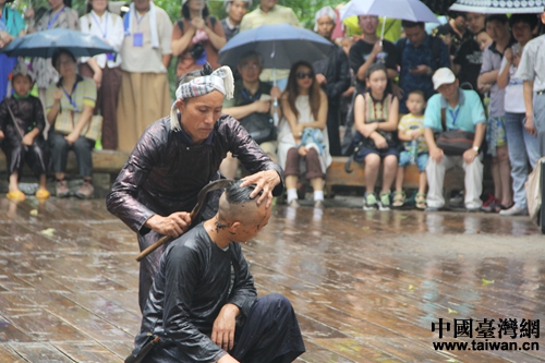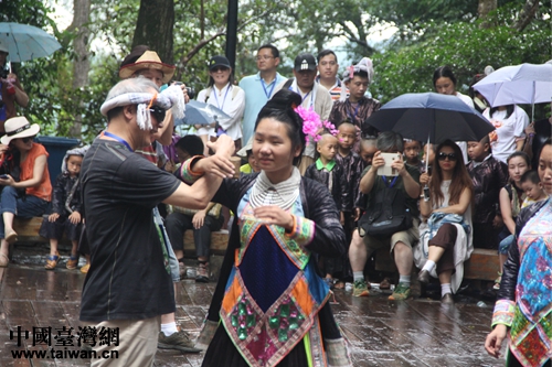 中国台湾网7月14日黔东南讯 (记者 芜同)“情系多彩贵州——两岸文化联谊行”活动进入第三天,两岸文化界人士来到贵州黔东南苗族侗族自治州从江县岜沙苗寨,展开一场民族风情之旅。