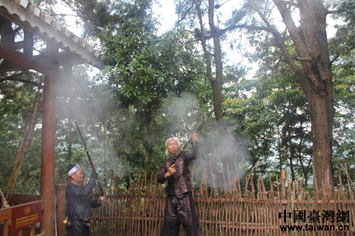岜沙在寨子门口鸣枪欢迎两岸嘉宾(中国台湾网 芜同 摄)