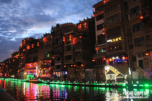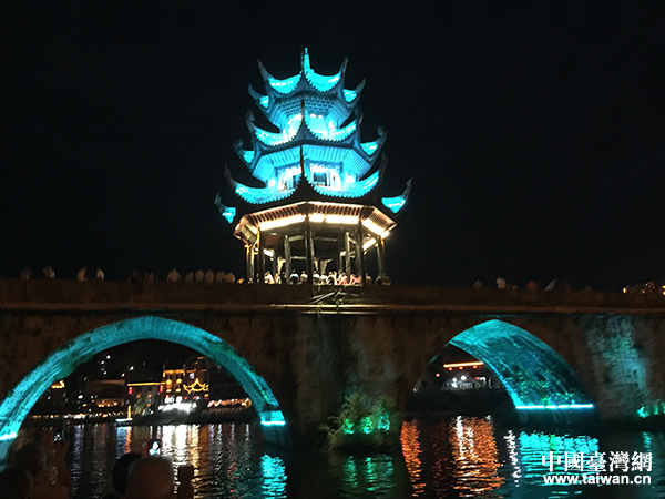 黄昏时分,舞阳河两岸华灯初上。台湾嘉宾们分别登上游船,泛舟河上。舞阳河两岸的徽派建筑的翘角屋顶都挂满了彩灯,与岸边的荷花灯一起,倒映在河水中,让人犹如行驶在画中。