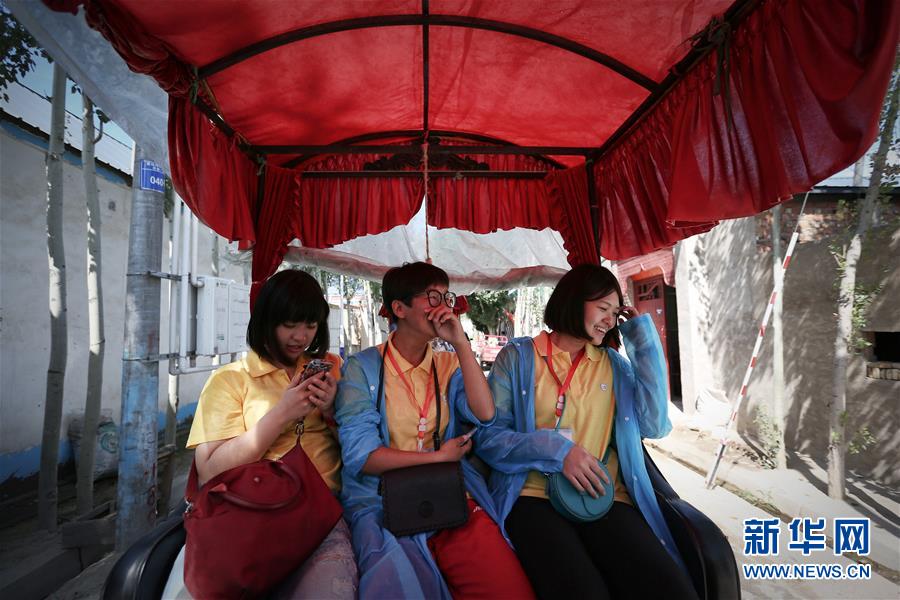在新疆伊犁哈萨克自治州霍城县惠远古城,哈萨克族女孩阿依波塔(中)与来自台湾彰化的王静娴(右)一起坐马车参观游览。新华社 程婷婷 摄