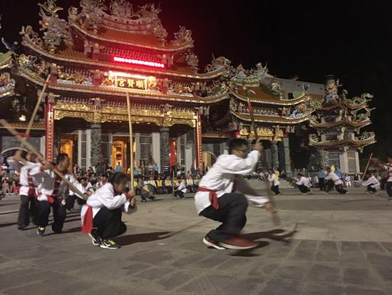 5日晚上,交流团一行来到位于高雄内门的顺贤宫。虽然已是晚上近9点,但欢迎仪式依然隆重热烈。顺贤宫特意在门前广场上,上演了一出“宋江阵”。