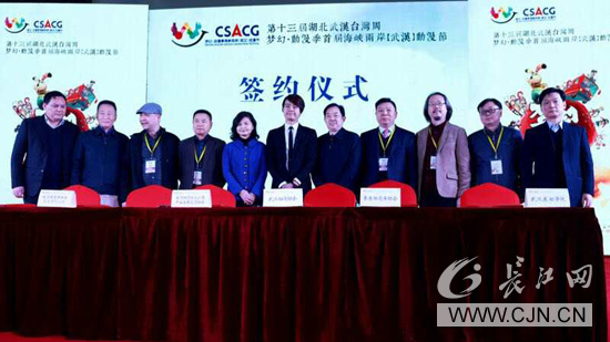 随后,主持人邀请海峡两岸机构及企业代表上台进行签约仪式。余培侠等嘉宾上台见证。武汉动漫协会与台湾动漫文化创意产业发展交流协会、武汉东湖学院与香港动漫画协会、武汉博润通文化科技股份有限公司与台湾冉色斯动画股份有限公司六家单位分别签署战略合作协议,将在行业组织协作、产学研交互融合、业务拓展开发等方面开展广泛合作与对接。见证嘉宾表示,签约仪式象征着海峡两岸动漫文化创意产业融合发展的新起点。