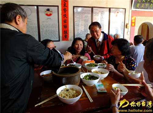 范成祥先生代表在场的30多位台湾乡亲发言,他说:“很高兴有机会来参加两岸擂茶文化交流,不只是擂茶,今天我还带来了台湾客家糯米糕以及新竹有名的新埔柿饼,而这些台湾客家美食,其实都是源自于大陆原乡,只是到台湾后,做法和口味多少有些改变,尤其是近来年,这些客家美食变得更专业、更精致,不再是家家户户随意就能做得来,这些美食的根在原乡,过去30年来我们都是人回来寻根,今天是台湾擂茶回来寻根。”他表示,今后愿意让更多的客家饮食也回来寻根,做一些两岸客家美食间的交流活动。