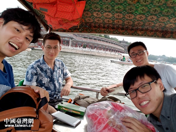 两岸青年钟大益、钟明佑、吴博钢和马阔在北海公园泛舟,在白塔的映衬下,小船显得更有情趣,无论是撞到其他的船还是因为乱动造成的摇晃,都能引来笑声一片。(中国台湾网发)
