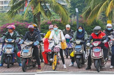 一月九日,海口钟楼附近,骑车出行的人们穿着厚厚的冬衣。