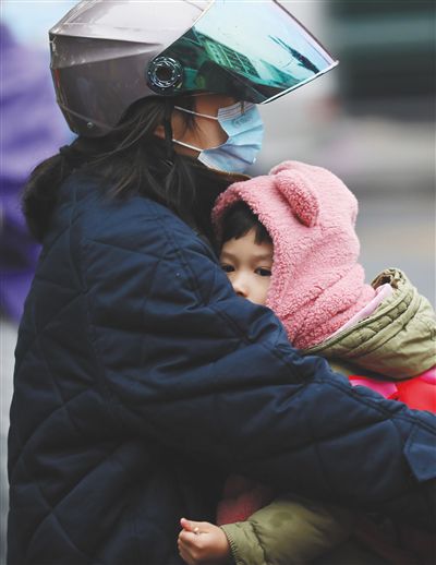 1月8日,海口街头,一位小朋友依偎在大人怀中。