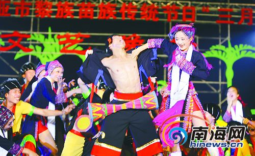 为庆祝黎族、苗族同胞的传统节日“三月三”,三亚市27日在“梦里黎乡”槟榔河旅游区举行了一场晚会以及一系列民族风俗竞技活动,10万市民和游客涌进槟榔河,载歌载舞尽情联欢。