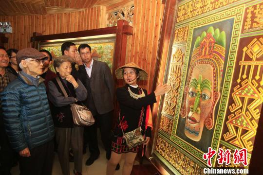 12月30日,参加2013两岸诗会的著名诗人余光中先生等台湾及海外华人、大陆诗人,到海南甘什岭槟榔谷原生态黎苗文化旅游区采风。图为诗人们参观景区内的黎族文化展览馆。中新社发 张茜翼 摄
