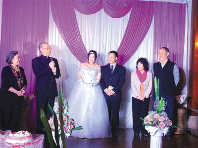 12月27日,在两岸诗人黑侠和龙青的婚礼上。著名播音艺术家方明(左二)、著名海洋诗人汪启疆(右一)分别携夫人担任证婚人。本报记者 蔡倩 摄