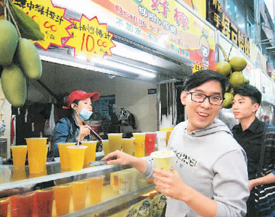 来自海峡两岸的媒体记者12月18日起在海南省展开“一带一路”、琼台合作专题采访。记者18日在台商经营的海口泰龙城琼台小吃街采访在此创业的台湾青年。家在台北的廖信翰留学毕业后落户海口,用台湾夜市的模式将自己的4个摊档经营得生意红火。图为廖信翰正在招呼客人。