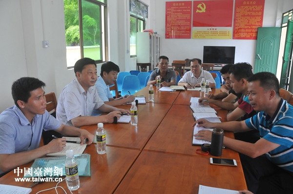 海南省台办主任刘耿在扶贫联系点与村镇干部共同研究扶贫工作。(图片来源:海南省台办)