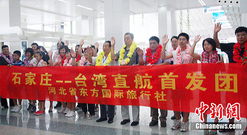 7月29日,河北飞往台湾的直航航线正式开通。在石家庄正定机场大厅内,即将登机的河北首发团友合影留念,记录这历史性的一刻。至此,河北至台湾一日生活圈已成为现实。中新社发 翟羽佳 摄
