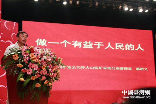 郭明义做以“做一个有益于人民的人”为主题先进事迹报告。(中国台湾网 郜利敏 摄)