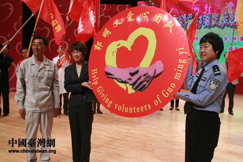 郭明义为沧州市20支志愿服务组织颁发“郭明义爱心团队”标牌。(中国台湾网 郜利敏 摄)