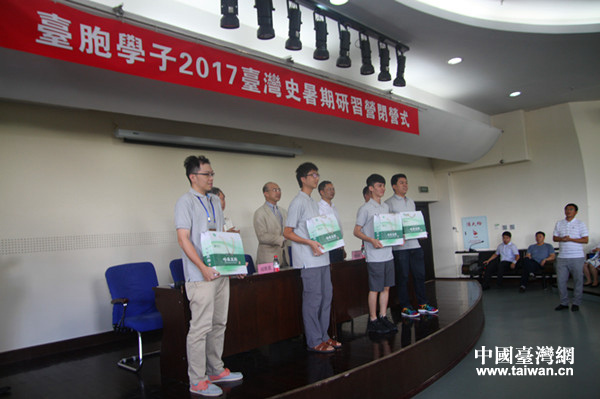 中国台湾网7月25日哈尔滨消息 (记者 李杰)24日,由全国台联和海峡两岸交流中心共同主办的“台胞学子2017台湾史暑期研习营”在哈尔滨工业大学举行闭营式,全国台联副会长纪斌、黑龙江省台联会长刘继维、哈尔滨工业大学校党委常务副书记熊四皓、黑龙江省台联党组书记衣光、全国台联研究室主任陈立谦、哈尔滨工业大学统战部长张淑娣、夏朝联合会评议长许育嘉、台湾《远望》杂志社总编辑石佳音、青雁和平教育基金会董事暨执行长乔正中等领导和嘉宾出席了闭营式,并为在研习营微视频评选中获奖的营员颁奖。