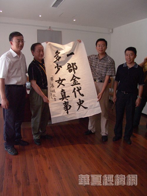 华夏经纬网8月5日讯:台湾新党教育交流团一行今天上午从牡丹江市返回哈尔滨,中午受阿城区委统战部副部长王宏伟接待,并赴金上京历史博物馆进行参观。郁慕明主席书“一部金代史;多少女真事”送给博物馆。