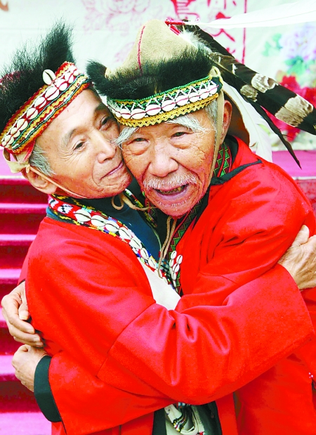 12月18日上午,在阿里山乡达邦村特富野社区,邹族头目汪念月(左)与邓州市张村镇上营村村委主任汤清义(右)紧紧拥抱在一起。 记者 陈伟 摄