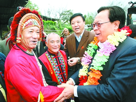一个是阿里山,一个是千山万水之遥的河南,在这一刻却显得如此亲密无间。原来,300多年前,台湾阿里山邹族那思罗等村民随郑成功部将黄廷赴河南邓州市屯垦,与当地居民和睦相处,繁衍生息十三代,在今天邓州市的张村镇上营村形成了580户、2600多名台湾少数民族后裔的“台湾村”,他们至今还保存着许多台湾邹族的生活习惯和风俗礼仪。作为“中原文化宝岛行”的重要内容,上营村村主任汤清义率村民代表来特富野探亲谒祖,徐光春亲自来参加他们的探亲联谊活动。